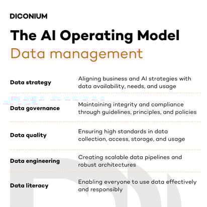 Effective data management ensures that AI-driven processes and systems are built on a reliable, accessible, and trustworthy data foundation, spanning five core areas: data strategy, data governance, data quality, data engineering, and data literacy.
